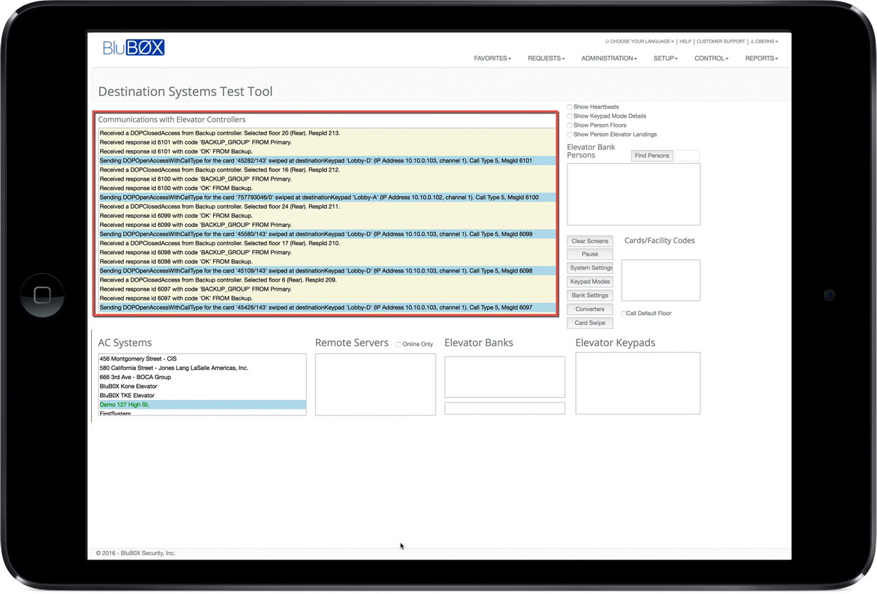| The DDE Diagnostics (formerly known as Destination Test Tool) is a crucial tool for Integrators while deploying and maintaining a destination dispatch system. This menu provides options for analyzing the state of the system and great tools for debugging a Person's access rights. This article discusses some of the important features provided through this option. The Controller-Door-Floor Diagnostics tool is an important tool for Integrators. This tool extends the ability to manage a system remotely and provides powerful tools for updating and controlling the physical hardware. In this article, we discuss some of the options you will find in this menu. The Input-Output Diagnostic page provides a method to control and diagnose the Monitoring Points and Control Points of a System. This article gives a high level look at what the Input-Output Diagnostic can accomplish. The Power Diagnostics tool is a critical part of being able to remotely support a BluSKY System. This tool provides important insights into the power system that operates the hardware, something that used to require a local person on the network. Did we mention this is all available without punching holes through the firewall? All together BluSKY provides an unprecedented ability to remotely control and support an installation from anywhere connected to the internet. Any windows-based device that installs the Server Manager Service can be monitored and managed remotely using BluSKY Server Diagnostics. This includes seeing installed operating systems, applications and locations, installed versions, assigned versions, memory allocation, CPU utilization, etc. It also includes remote control capabilities such as rebooting, starting and stopping services, copying files, deleting files, etc. Local Server Diagnostics is also used for manually updating locally installed BluBØX software and can even update the Local Server Manager Service. Access Level Diagnostics Alarm Diagnostics Allegion NDE Diagnostics ASSA ABLOY DSR Diagnostics Controller Diagnostics Controller-Door-Floor Diagnostics Database Diagnostics DDE Diagnostics Floor Stop Schedules Diagnostics Input-Output Diagnostics Power Diagnostics Server Diagnostics Person Reader Diagnostics Video Diagnostics AI Diagnostics Platform Diagnostics | Click to Enlarge |