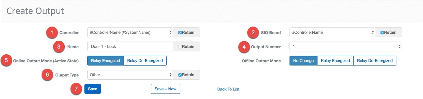 Now to configure the second doors Output. All of the settings will stay the same except the Output Number and Name, coincidentally only the fields that do not have the Retain box checked by default.
