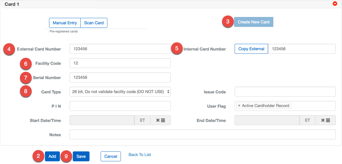 All we have to do now is add a card to his personnel record. Every Card that is assigned to a Person must be registered in BluSKY. This can be done in two ways. The first is by preregistering the Card through the Card Upload screen, or doing it at the time of assignment. We will only be adding five Cards so we chose to do this manually. There are many different types of Cards with different lengths and encoding formats. In this example, we will walk you through the process of adding a 26 bit Card with a Facility Code, you may have to make adjustments to accommodate the Cards you have on hand.