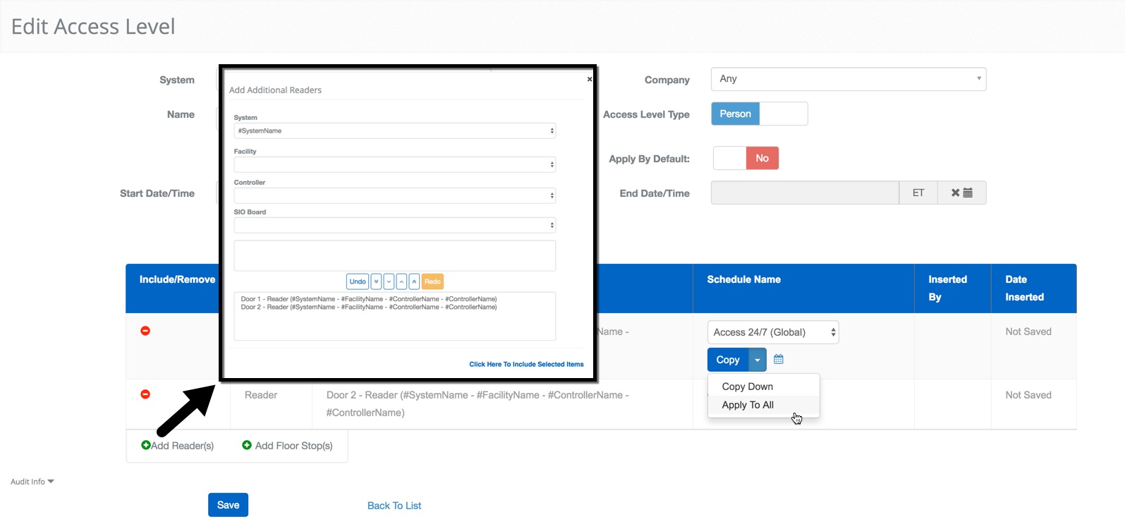 - Assign the schedule to all of the Readers by clicking the chevron the right of the copy button and clicking Apply To All.