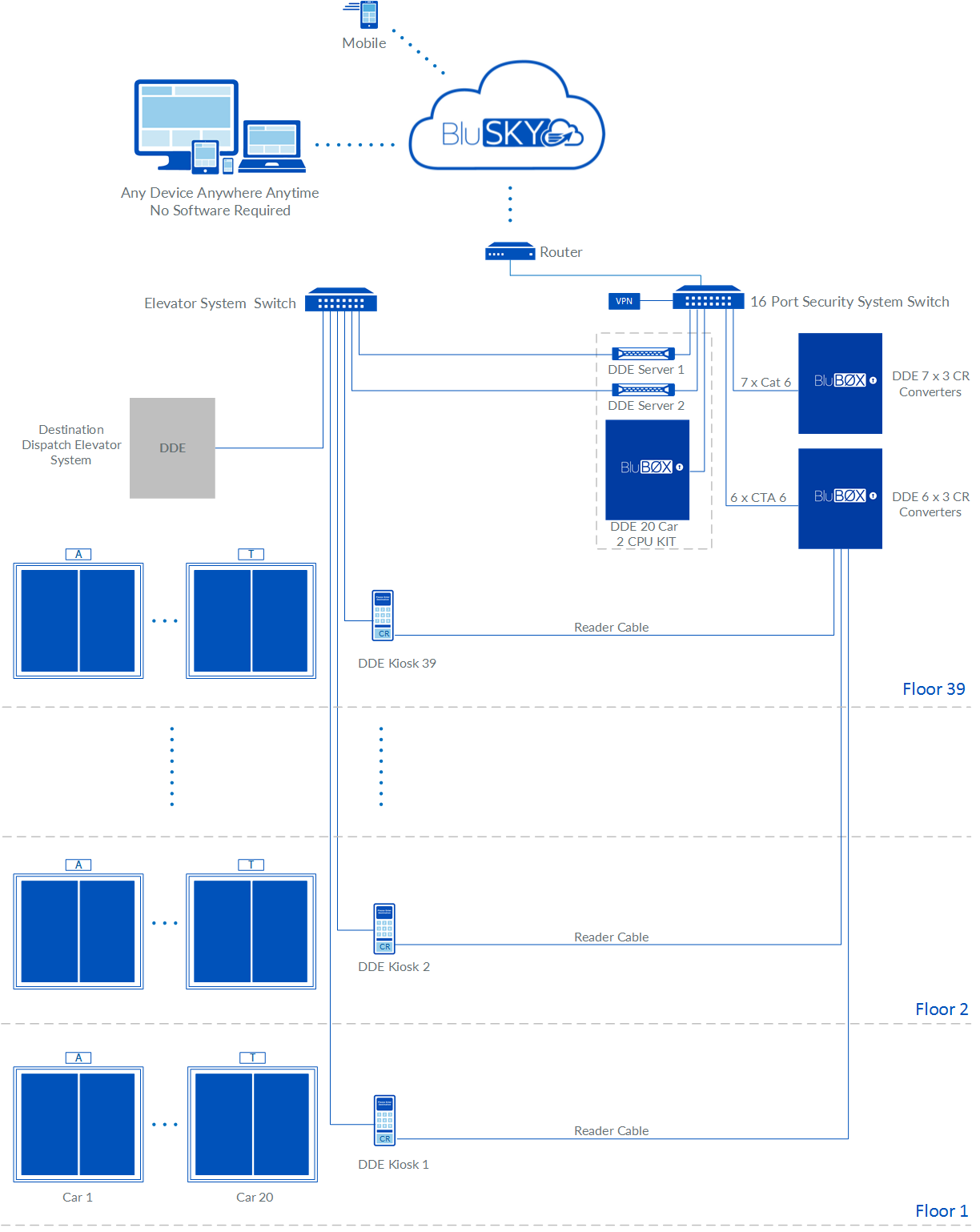 20 Car Destination Dispatch Elevator Physical Access Control System - Readers Connected to Security System
