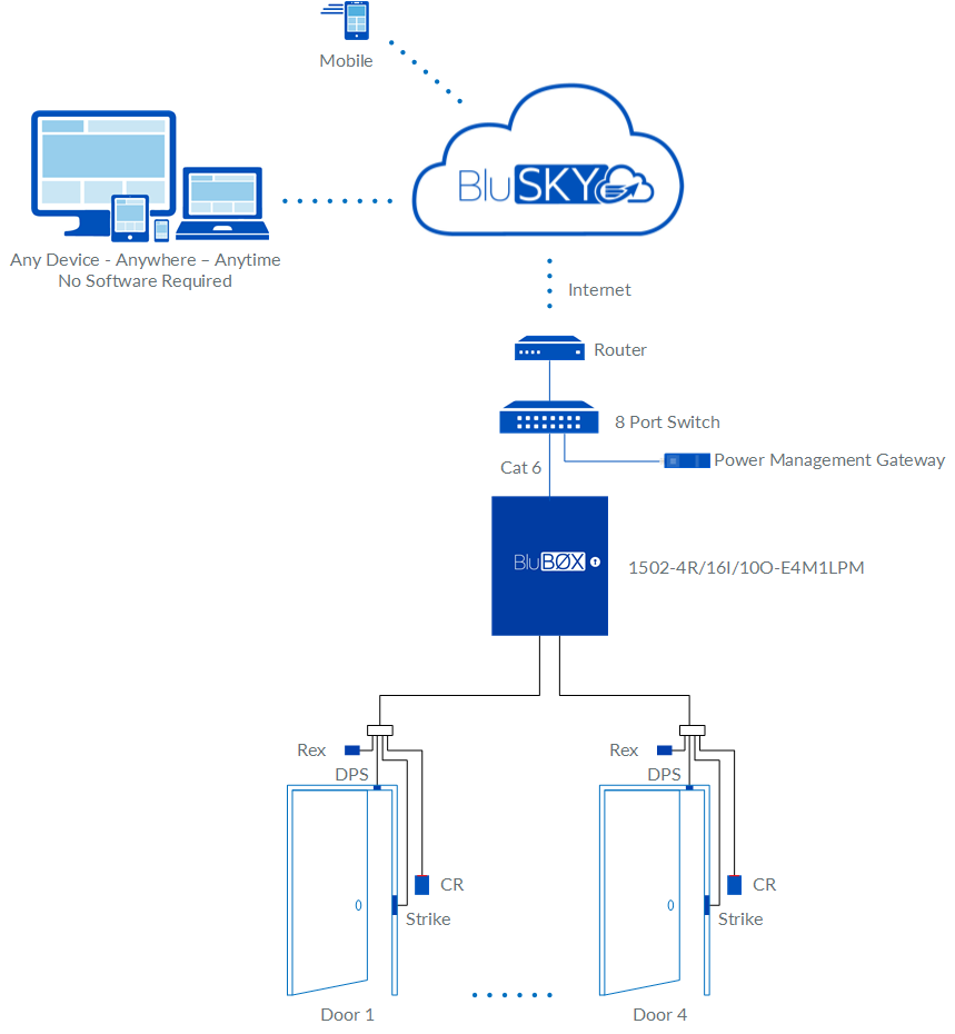 *BluBØX provides 3 variants for each Access Control kit. The kit shown is recommended for new installations and provides integrated power supply, lock power, and power management. Less expensive options are available with power supply and lock power (752-5000) or just power supply (752-5100). The Power Management Gateway is not required for these options.