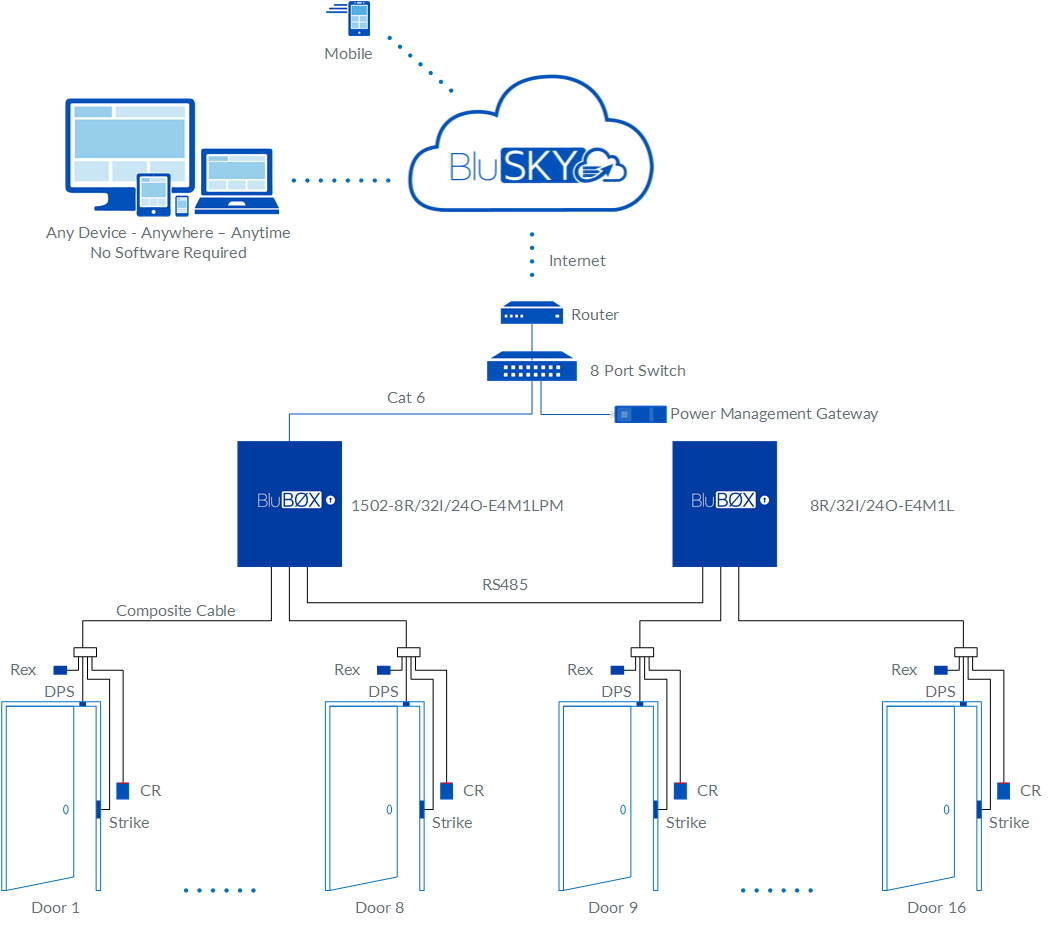 *BluBØX provides 3 variants for each Access Control kit. The kit shown is recommended for new installations and provides integrated power supply, lock power, and power management. Less expensive options are available with power supply and lock power (752-5000) or just power supply (752-5100). The Power Management Gateway is not required for these options.